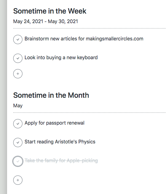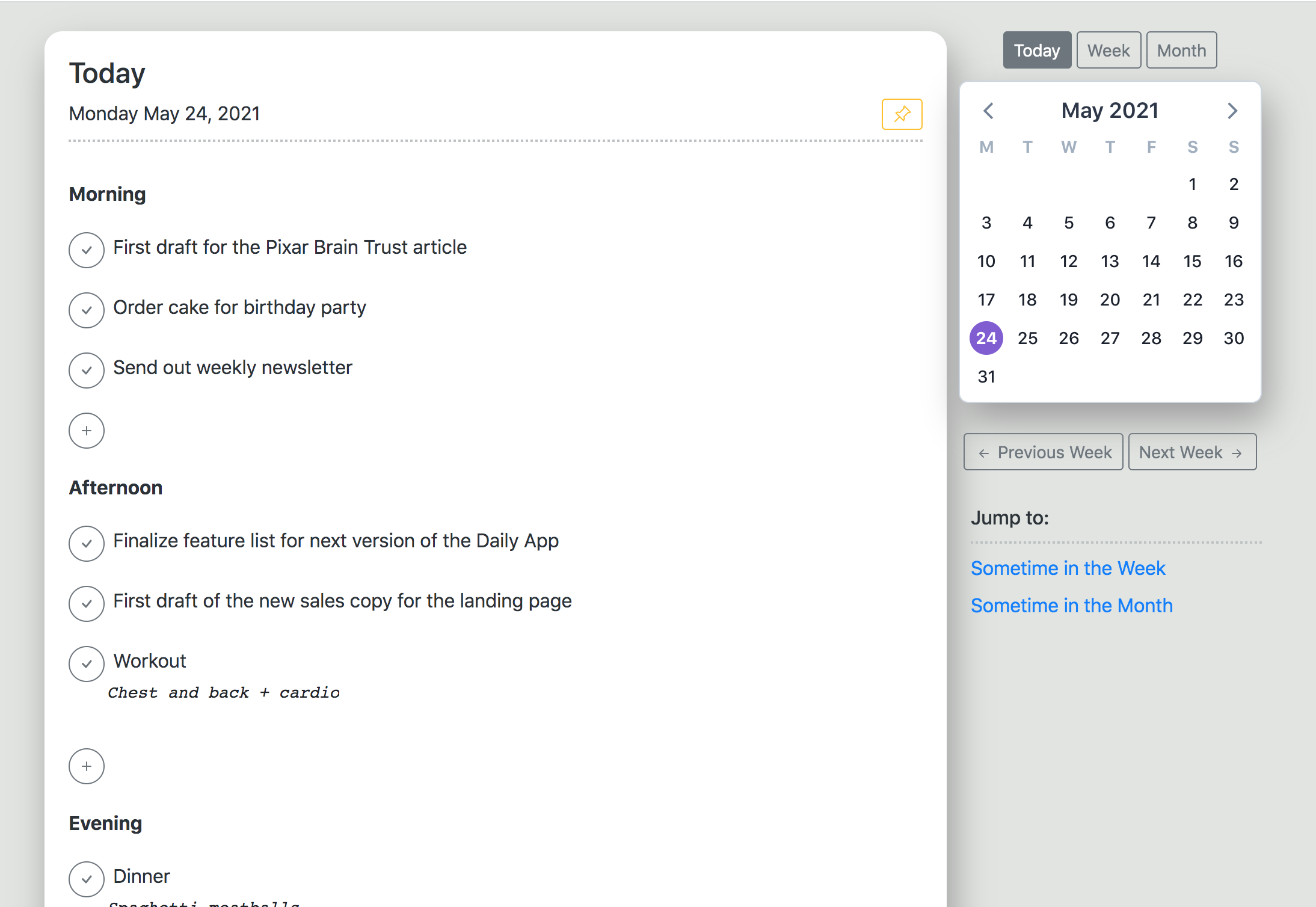 The Daily App enables you to schedule tasks for "sometime in the week" or "sometime in the month". Once the week or month comes around, you can pick up those tasks and slot them into a specific day or knock them out and check them off the list. It's a great way to unload your mind and stay on top of what's important.